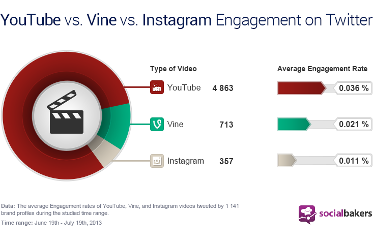 Das Ergebnis: Die große Mehrheit – nämlich knapp 4900 oder umgerechnet 82 Prozent – waren YouTube-Clips. Vine kommt immerhin auf 713 oder gut 12 Prozent Video-Filmchen, während Instagram gerade mal halb so groß wie die Twitter-Tochter ist.