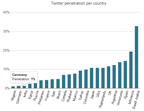 Gerade mal ein Prozent der hiesigen Internet-Nutzer ist monatlich bei dem US-Kurznachrichtendienst aktiv. In Saudi-Arabien sind es ein Drittel.