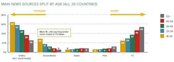 Die Faustregel lautet: Je jünger ein Nutzer, desto stärker bezieht er Nachrichten über Online-Medien und Social Media. Und je älter ein Nutzer, desto wichtiger wird das klassische Fernsehen als News-Quelle. Auffällig zudem: Für 18- bis 24-Jährige sind soziale Netzwerke sogar bereits wichtiger als TV.