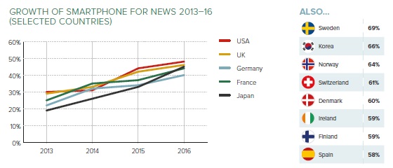 Zudem setzt Mobile auch im News-Sektor seinen Siegeszug fort: Mehr als die Hälfte der Befragten in allen Ländern nutzt das Smartphone, um Nachrichten zu lesen (53 Prozent). In ausgewählten Staaten wie Schweden oder Südkorea nähert sich der Anteil bereits der zwei-Drittel-Marke.