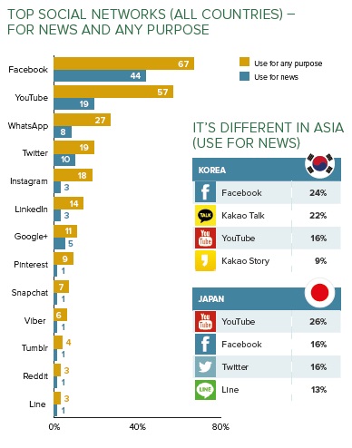 Quer über alle betrachteten Länder ist Facebook mit einem Anteil von 44 Prozent die mit Abstand wichtigste Nachrichtenquelle, gefolgt von YouTube. Twitter folgt mit schlappen 10 Prozent erst auf Rang drei. Dabei ist die Nutzung in Asien signifikant anders: