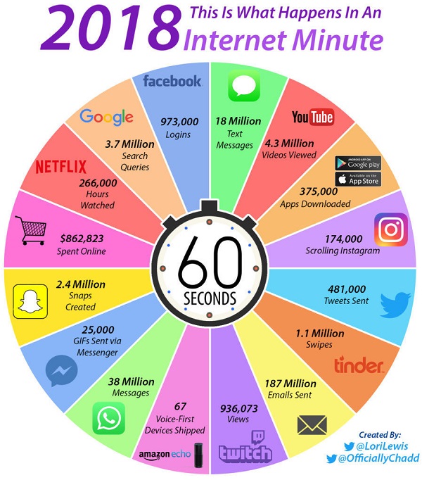 Das zeigt sich immer wieder ganz besonders eindrucksvoll, bricht man die Daten auf einen Zeitraum von 60 Sekunden herunter: Denn was im Jahr 2018 in jeder Minute im Internet passiert, ist beachtlich – vor allem im Langfristvergleich.