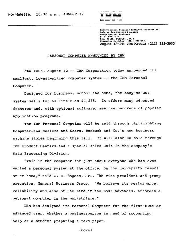 IBM-Pressemitteilung vom 12.8.1981 (Quelle: IBM)