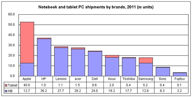 Wie sehr Apple von jenem Umschwung profitiert, macht eine Studie des taiwanesischen IT-Blogs Digitimes deutlich: Unter der Überschrift „Der Apple-Schock sorgt für einen Umbau der IT-Industrie“ haben die Analysten den Einfluss von Tablets vor allem auf das Geschäfts mit tragbaren Computern untersucht. Das Ergebnis: Während Apple weder bei Gartner noch bei IDC unter den Top-5 des Gesamtmarktes rangiert, kommt das Unternehmen sogar auf den Spitzenplatz vor Hewlett-Packard und Lenovo, addiert man Tablet- und Notebook-Verkäufe. Außer Apple macht nur noch Samsung im nennenswerten Umfang Geschäft mit den Rechen-Flundern, wie die folgende Grafik beweist: