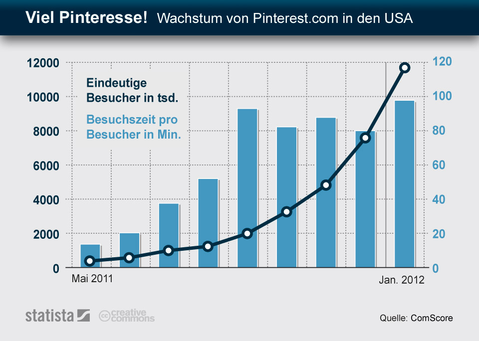 Bereits im vergangenen August wählte das amerikanische „Time Magazine“ Pinterest auf Platz 38 der 50 wichtigsten Webseiten des Jahres 2011. Die Besucherzahlen scheinen die Kür zu rechtfertigen: Zwischen Mai 2011 und Januar 2012 vervielfachte sich die Zahl der eindeutigen Besucher von deutlich unter einer Million auf fast 12 Millionen, wie das Marktforschungsunternehmen Comscore jüngst ermittelte. Mehr noch: Den Daten zufolge hat Pinterest die Zehn-Millionen-Marke schneller überschritten als jede andere Einzelwebseite in der Internet-Geschichte, so das US-Techblog „TechCrunch“.