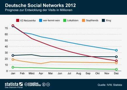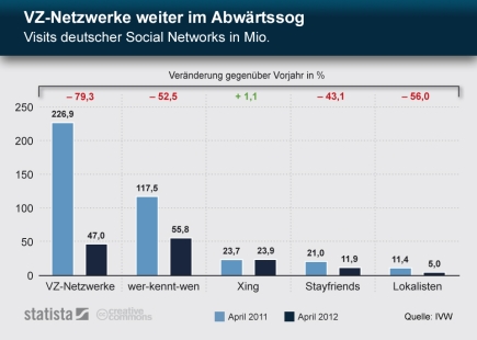 Soweit ist es zwar noch nicht. Aber laut Ende vergangener Woche von der IVW veröffentlichten Marktzahlen hält der Abwärtstrend vor allem der sozialen Netzwerke aus Deutschland an. So brach beispiele die Besucherzahl der VZ-Netzwerke – zu ihnen zählen neben StudiVZ auch die Schwestern SchülerVZ und MeinVZ – im April 2012 im Vergleich zum entsprechenden Vorjahresmonat um gut 80 Prozent von knapp 230 Millionen auf 47 Millionen ein. Die Konkurrenten Wer-kennt-wen, Stayfriends und Lokalisten schrumpften ebenfalls. Nur das auf professionelle Nutzer spezialisierte Karriereportal Xing blieb im betrachteten Zeitraum stabil.