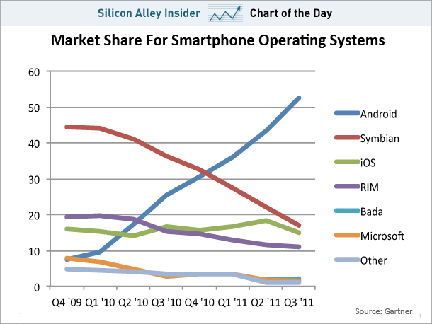 Parallel zu den Aktivierungen ist auch der Marktanteil von Android innerhalb des Smartphone-Segments regelrecht explodiert. Bis Ende 2011 stieg der Marktanteil des Google-Betriebssystems laut Marktforschungshaus Gartner auf mehr als 50 Prozent – vor allem zu Lasten von Nokia und Blackberry.
