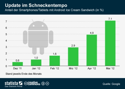 Ein weiterer Schwachpunkt bei Android ist erst in dieser Woche wieder einmal deutlich geworden – und zwar indem Apple-Chef Tim Cook bei Apples Entwicklerkonferenz WWDC am Montag den Finger in die Wunde legte: Demnach seien bereits 80 Prozent aller Apple-Mobilgeräte auf der aktuellen, im Oktober 2011 veröffentlichten Betriebssystem-Version iOS 5. Auf die jüngste Android-Version 4.0 mit dem Code-Namen „Ice Cream Sandwhich“, die ebenfalls Ende 2011 auf den Markt kam, haben laut Google dagegen gerade mal bescheidene sieben Prozent aller Nutzer aktualisiert.