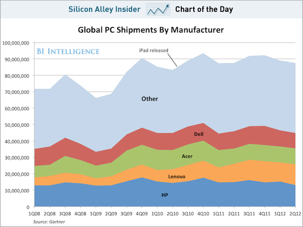 Das amerikanische High-Tech-Blog „Business Insider“ hat die Quartalszahlen zum PC-Markt in einer längerfristigen Grafik zusammengefasst. Der Hauptbefund: Von kleineren Schwankungen abgesehen stagniert das Geschäft mit klassischen Windows-Geräten seit der Einführung des iPad Mitte 2010. Hauptgrund: Das iPad habe den Netbook-Markt abgemurkst, den wichtigsten Wachstumstreiber der PC-Branche der Jahre davor.