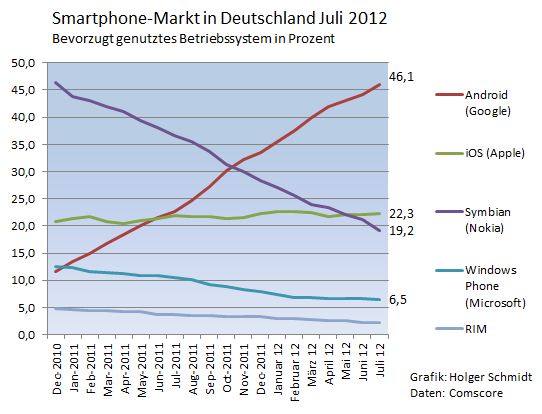 Es ist beileibe nicht das erste Mal, dass ich über dieses Thema hier im Blog schreibe. Aber die Schere, ja die Tragweite dieses Befundes wird tatsächlich sogar noch größer. Erst Anfang dieser Woche haben die Marktforscher von Comscore ihre monatlichen Zahlen zum Smartphone-Markt publiziert.