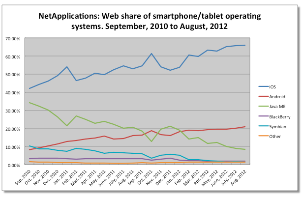 Laut aktuellen Zahlen vom Internet-Marktforscher NetApplications stammten im August gut 66 Prozent aller mobilen Web-Zugriffe von iOS-Geräten, also iPhones und iPads. Android kommt mit knapp 21 Prozent nicht mal auf ein Drittel dessen – auch wenn das Wachstum zuletzt höher war als bei iOS. Ähnliche Zahlen weist StatCounter in einer separaten Erhebung aus, wie Philip Elmer-Dewitt in seinem bei Fortune aufgehängten Blog „Apple 2.0“ Anfang der Woche angemerkt hat.