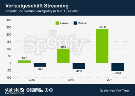 Parallel zu den Umsätzen von Streaming-Diensten wie Spotify oder Pandora scheinen aber auch die Verluste zu wachsen. Laut einem Bericht der „New York Times“ von Ende August hat etwa der auch in Deutschland populäre Musikdienst Spotify im vergangenen Jahr bei einem Umsatz von knapp 240 Millionen Dollar ein Minus von fast 60 Millionen Dollar eingefahren.