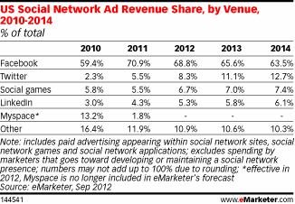 Dennoch kann sich Twitter dank des starken Wachstums auch im Heimatmarkt einen steigenden Anteil am gesamten Kuchen der Werbeumsätze in sozialen Netzwerken sichern: Von 5,5 Prozent im vergangenen Jahr soll sich der 140-Zeichen-Dienst bis 2014 auf 12,4 Prozent mehr als verdoppeln. Dann liegt Twitter in jenem Segment auf Platz zwei hinter Facebook – aber deutlich vor Social Games und dem Business-Netzwerk LinkedIn: