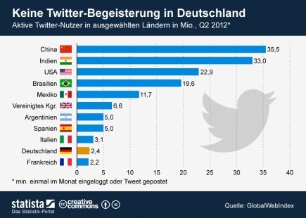 Mit aktiven Nutzern sind jene Mitglieder gemeint, die sich mindestens einmal im Monat bei Twitter einloggen oder dort eine Kurznachricht absetzen. Mit anderen Worten: Die Zahl der Deutschen, die wirklich regelmäßig Tweets absetzen, dürfte noch deutlich unter jenen 2,4 Millionen liegen.
