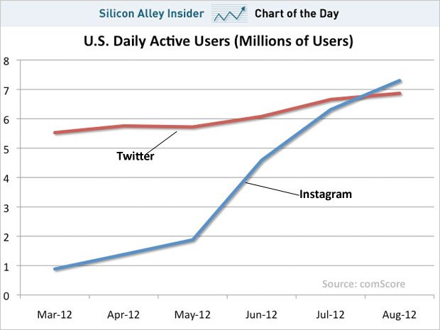 Wie das zum „Wall Street Journal“ gehördende Technologie-Blog „All Things D“ berichtet, lag Instagram sowohl bei der Zahl der durchschnittlichen Besucher am Tag sowie der Verweildauer vor seinem Konkurrenten. So hat Instagram im Schnitt 7,3 Millionen Tagesbesucher erzielt; bei Twitter waren es nur 6,9 Millionen. Damit hat der Fotodienst seine Tagesnutzung seit Mai mehr als verdreifacht: