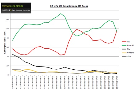 Mehr noch: Die Marktbeobachter erwarten gar einen neuerlichen Rekord für die Jungs aus Cupertino: „Wir prophezeihen, dass Apple sein bisheriges Allzeithoch von 49,3 Prozent übertreffen und den höchsten Anteil am US-Smartphonegeschäft überhaupt in den nächsten zwei Zwölf-Wochen-Perioden erreichen wird“, lässt sich Kantar-Mann Dominic Sunnebo zitieren.
