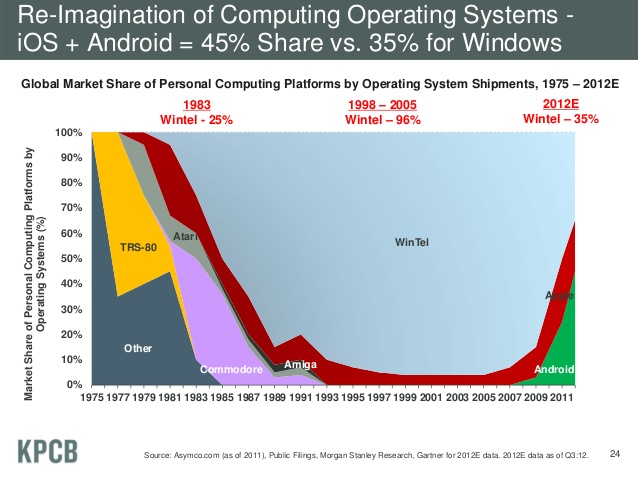 Interessante Graphiken und auch wenn die Aussage stimmt, so zeigt sich auch, dass Smartphone und Tablets den nur Markt ergänzen. Die Verkaufszahlen von PCs und Laptops sind jedoch recht stabil und diese Nische wird weiterhin von Wintel dominiert. Auch wird ignoriert, dass Tablets und Smartphones derzeit (sowohl von der Hard- als auch der Software) nicht den klassischen PC ersetzen können. Sicher wird sich das Konzept des PC durch den Einfluss von Tablets in Zukunft stark ändern (und die Grenze zwischen Laptops, Notebooks, Netbooks und Tablets wird irgendwann verschinden), aber hier vom Ende von Wintel zu sprechen, halte ich für übertrieben.