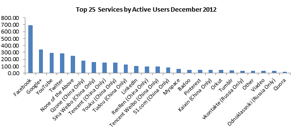 Laut GlobalWebIndex sei im vergangenen Jahr auch noch nichts von der vielbeschworenen „Facebook-Müdigkeit“ zu spüren gewesen – ganz im Gegenteil: Demnach konnte das weltgrößte soziale Netzwerk die Zahl seiner aktiven Nutzer 2012 um stolze 33 Prozent auf knapp 700 Millionen steigern: