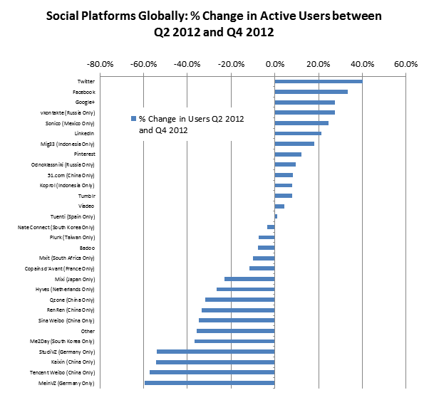 Die wichtigsten Ergebnisse: Das schnellstwachsende soziale Netzwerk gemessen an aktiven Nutzern (das sind solche User, die jenes Medium in dem vergangenen Monat genutzt oder dazu beigetragen haben) war Twitter: Die Mikroblogging-Plattform legte zwischen dem zweiten und vierten Quartal 2012 um 40 Prozent auf 288 Millionen aktive Nutzer zu.
