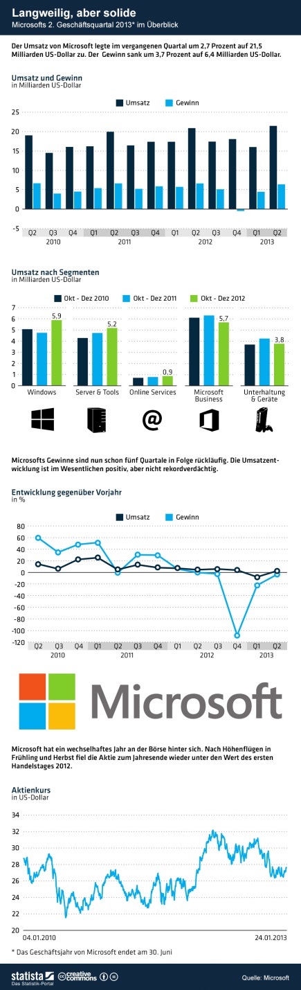 Rückschau auf aktuelle Quartalsberichte, vierter Teil (davor: 1. Ebay, 2. Google, 3. Apple): Vor zwei Wochen hat Microsoft seine Zahlen für den Drei-Monats-Zeitraum zwischen Oktober und Dezember 2012 vorgelegt. Demnach erzielte der Softwaregigant einen Umsatz von 21,5 Milliarden Dollar (+2,7 Prozent) und einen Nettogewinn von 6,4 Milliarden Dollar (-3,7 Prozent).