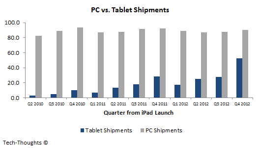 Seit dem Start des Vorreiters iPad Anfang 2010 hat das Tablet-Geschäft dagegen eine enorme Dynamik entwickelt: Bis Ende 2012 stieg der Quartalsabsatz laut IDC weltweit auf 53 Millionen Rechenflundern.