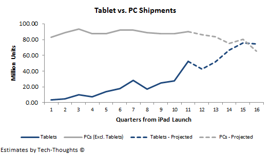 Basierend auf den Wachstumsraten von PCs und Tablets in der Vergangenheit hat Singh die künftigen Verkaufszahlen extrapoliert. In der konservativen Lesart würden die Rechenflundern erstmals 16 Quartale nach dem iPad-Start vor PCs liegen – das wäre das erste Quartal 2014.