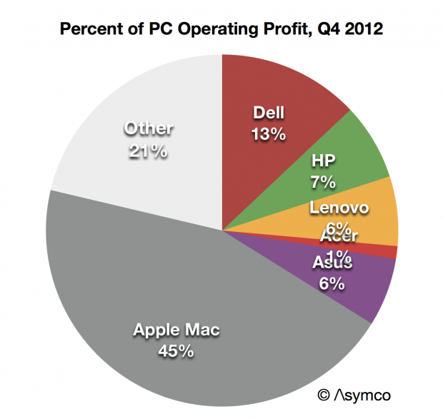 So erwirtschaftet die Jungs & Mädels aus Cupertino mehr Gewinn als die Top-5 PC-Hersteller Lenovo, Hewlett-Packard (HP), Dell, Acer und Asus zusammen. Bezogen auf die gesamte PC-Industrie vereinnahmt Apple immerhin 45 Prozent des gesamten operativen Gewinns auf sich.