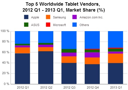 Bei den einzelnen Herstellern musste im 12-Monats-Vergleich vor allem Apple federn lassen. Zwar konnte auch der Marktführer seine Stückzahlen auf knapp 20 Millionen iPads steigern. Weil der Zuwachs von 65 Prozent deutlich unter dem Wachstum des Gesamtmarkts lag, sackte der Marktanteil von fast 60 Prozent im ersten Quartal 2012 auf nur noch 40 Prozent.