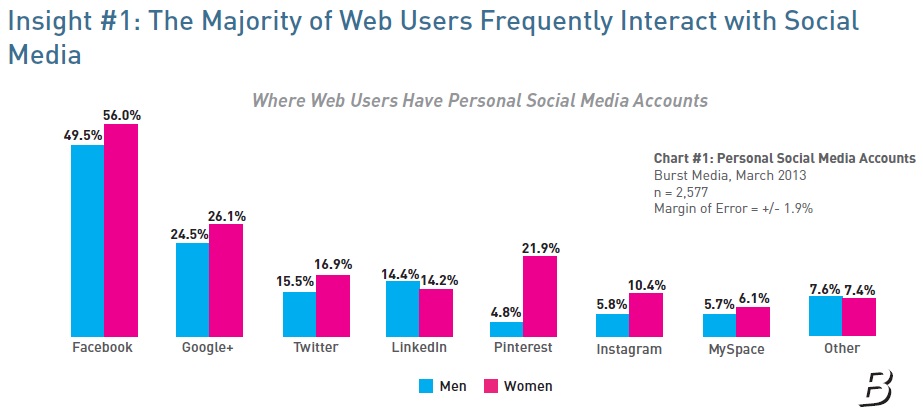 Das jedenfalls hat laut Burst Media eine im März 2013 durchgeführte Umfrage unter 2577 Amerikanern ergeben. Demnach haben in den USA 26 Prozent aller Frauen und knapp 25 Prozent aller Männer ein Konto bei Google+ (das komplette PDF der Studie gibt’s hier).