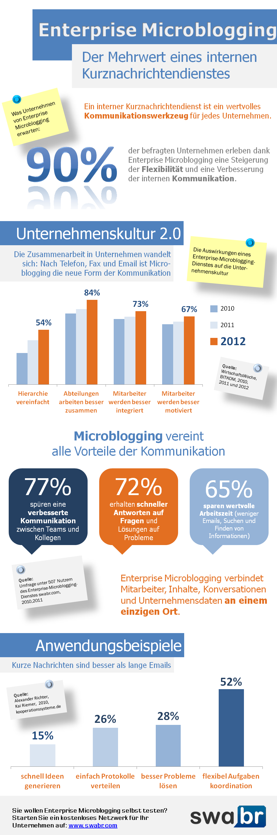 Auch in Deutschland gibt es inzwischen entsprechende Angebote. Das Berliner Startup Swabr versteht sich als soziales Netzwerk für Unternehmen. Swabr gibt’s als kostenlose Einstiegsvariante sowie seit Anfang Mai als kostenpflichtige Premium-Version. Die angeblichen Vorteile von Enterprise Microblogging – also gewissermaßen Twitter für Unternehmen – hat Swabr in untenstehender Infografik zusammengefasst.