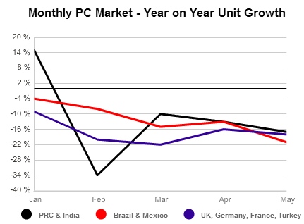 Wie IDC jetzt ermittelt hat, schwinden nun die Hoffnungen, dass die Geschäfte im zweiten Quartal substanziell besser laufen. Zwar schrumpfte der PC-Absatz im April „nur“ um 10 Prozent – allerdings beschleunigte sich der Rückgang im Mai auf gut 18 Prozent: