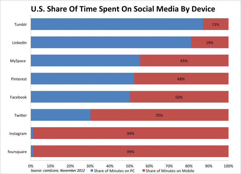 Instagram und Foursquare werden fast zu 100 Prozent am Smartphone oder Tablet genutzt – der Blogdienst Tumblr dagegen noch fast vollständig am PC.