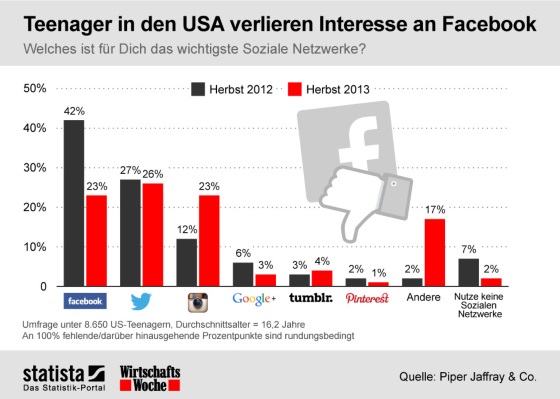 Als Grundlage dient stets eine Studie über das Konsumverhalten von amerikanischen Teenagern, die die US-Investmentbank Piper Jaffray zweimal im Jahr durchführt. Aktuell hat das Thema freilich zusätzliche Brisanz gewonnen: Denn Facebook hat bei der Vorlage seiner Quartalszahlen Ende Oktober erstmals selber ein schwindendes Interesse junger Nutzer eingeräumt.