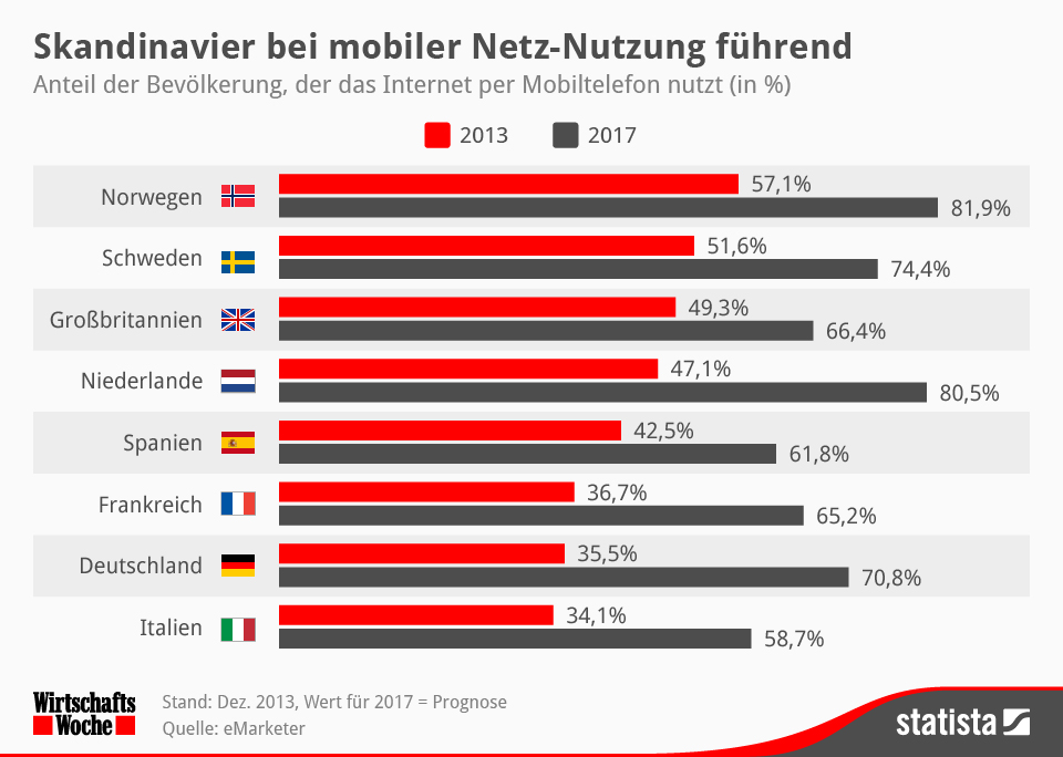 Damit rangiert Deutschland weit hinter anderen Staaten Westeuropas: Vor allem in Skandinavien und Großbritannien surft inzwischen bereits gut die Hälfte der Bevölkerung drahtlos übers Mobilfunknetz.