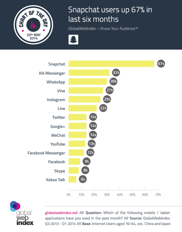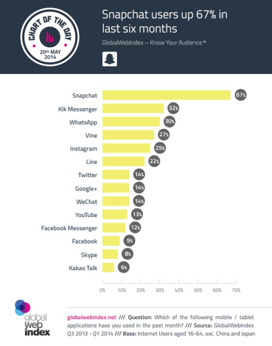 Der auf auf selbstlöschende Foto- und Video-Messages spezialisierte Dienst Snapchat hat bei Messaging-Apps den größten Sprung nach vorne gemacht.