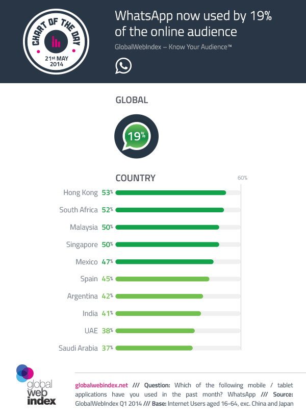 Insgesamt nutzt inzwischen fast jeder fünfte Internet-User WhatsApp. Auffällig ist die starke regionale Ungleichheit: Laut GlobalWebIndex nutzen den Dienst gerade mal drei Prozent der US-Nutzer. Dafür liegt die Durchdringung in Ländern wie Hongkong, Südafrika oder Malaysia jenseits der Schwelle von 50 Prozent: