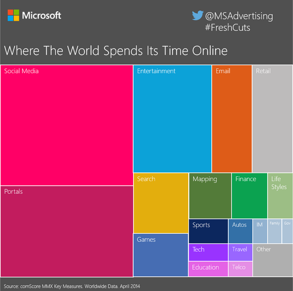Eigentlich hat man es ja immer geahnt: Die mit Abstand meiste Online-Zeit verbringen wir alle in den sozialen Netzwerken wie Facebook, Twitter & Co. Das jedenfalls belegt eine interessante Grafik, welche die Anzeigensparte von Microsoft in der vergangenen Woche per Tweet verbreitetet hat.