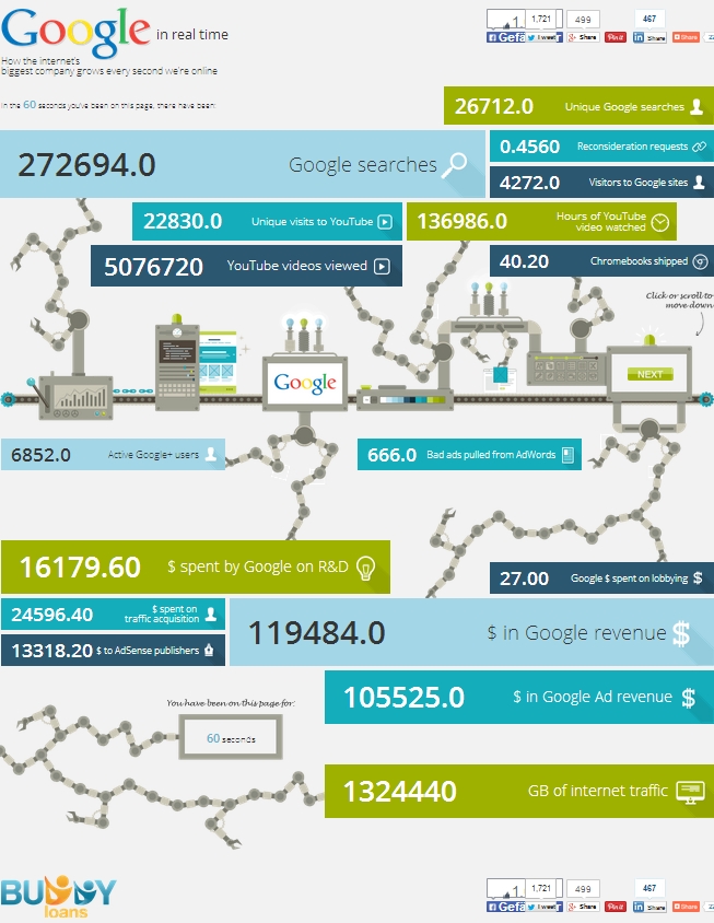 Zum Start nach meinem Sommerurlaub gibt’s noch mal eine schöne Infografik darüber, was in 60 Sekunden passiert – und zwar dieses Mal bei Google. Zusammengestellt hat die Daten der britische Vermittler von Privatkrediten BuddyLoans.