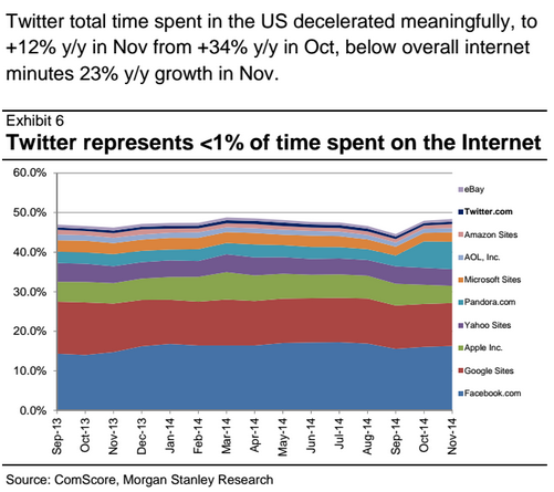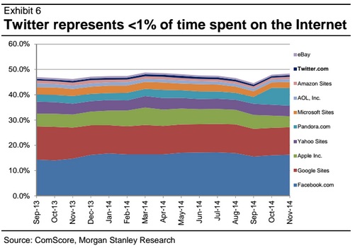 Das belegen einmal mehr aktuelle Zahlen der amerikanischen Investmentbank Morgan Stanley. Die Analysten haben auf Basis von Studien des Marktforschers Comscore den Anteil verschiedener Websites an der im Internet verbrachten Zeit erhoben. Dabei tritt Twitter seit mehr als einem Jahr mit weniger als einem Prozent auf der Stelle.