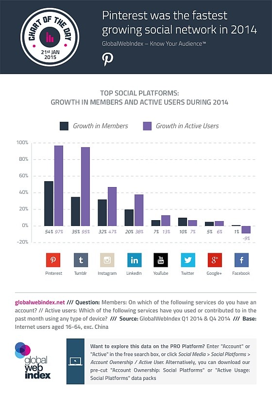 Das Ergebnis: Beim Kampf um die Pole Position als schnellstwachsendes soziales Netzwerk liefern sich Pinterest und Tumblr ein Kopf-an-Kopf-Rennen. Die digitale Bilderwand geht mit einem Plus von 97 Prozent bei den aktiven Nutzern als Sieger ins Ziel, gefolgt von Social-Blogging-Dienst mit 95 Prozent.