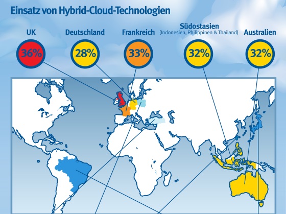 Interessant auch der internationale Vergleich: In Deutschland gaben 28 Prozent der Unternehmen an, bereits eine hybride Cloud zu nutzen – das entspricht ungefähr dem weltweiten Schnitt. Insgesamt liegen hiesige Firmen im oberen Mittelfeld: In Ländern wie Großbritannien oder den Niederlanden ist die Verbreitung mit jeweils 36 Prozent deutlich größer.