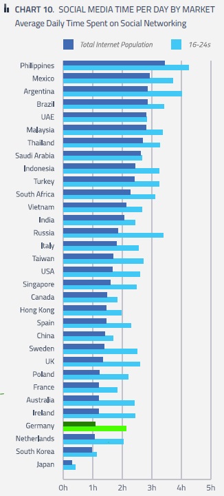 Ganz ähnlich ist das Bild bei der Betrachtung der durchschnittlichen Verweildauer in den sozialen Netzwerken am Tag: Auch hier rangiert Deutschland mit im Schnitt etwas mehr als einer Stunde – gemessen an der gesamten Internet-Population – am unteren Ende des Skala. Weniger sozial surfen wieder nur Niederländer und Japaner – plus, erstaunlicherweise, Südkoreaner.
