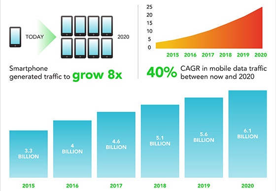 Gleichzeitig wachsen die Daten-Volumina im Mobilfunk bis 2020 um 40 Prozent pro Jahr. Insgesamt vervielfacht sich der von Smartphones erzeugte Internet-Datenverkehr bis zum Jahr 2020 um den Faktor 8 gegenüber heute.