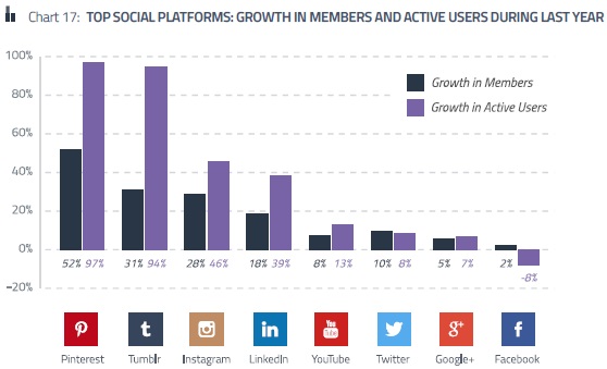 Das Ergebnis: Im ersten Quartal 2015 liegen die digitale Bilderwand Pinterest und das Blog-Portal Tumblr an der Spitze der schnellstwachsenden sozialen Plattform. Sowohl Pinterest wie auch Tumblr konnten die Zahl der aktiven Nutzer im Jahresvergleich fast verdoppeln (97 und 94 Prozent). Auf Rang drei liegt Instagram mit 46 Prozent:
