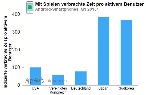So verbrachten Smartphone-Nutzer in Japan im Betrachtungszeitraum erstes Quartal 2015 viermal mehr Zeit mit mobilen Spielen als User in den USA; Südkorener daddeln fast genauso viel. Sogar noch größter ist der Abstand zu Großbritannien und Deutschland: