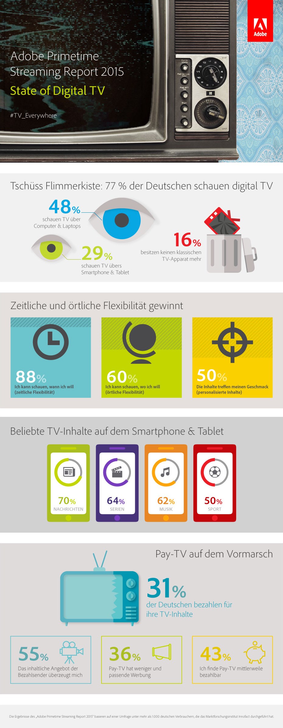 1. Das scheint mir eine sehr interessengeleitete Studie zu sein, um Adobe Primetiime zu pushen. Denn dann müsste sich binnen eines Jahres das Nutzungsverhalten gewaltig geändert haben. -> Auszug aus der ARD/ZDF-Onlinestudie 2014: 2014 ergibt sich eine Fernsehnutzung über das Internet (linear oder zeitversetzt) von täglich 8 Minuten. Dies entspricht einem Zuwachs von 3 Minuten gegenüber dem Vorjahr. Zusammen mit der im AGF-Panel gemessenen Sehdauer für Fernsehen über den klassischen Verbreitungsweg „Fernsehgerät“ linear (237 Min.) und zeitversetzt (3 Min.) ergibt sich eine Gesamtnutzungszeit für das Fernsehen von 248 Minuten. Der Anteil der Fernsehnutzung via Internet beträgt damit 3 Prozent (2013: 2 %), der Anteil der klassischen linearen Fernsehnutzung über Kabel, Satellit, Terrestrik oder IPTV am gesamten Fernsehkonsum 96 Prozent und der der zeitversetzten Nutzung 1 Prozent. (https://www.ard-zdf-onlinestudie.de/index.php?id=506) Ob wirklich „Mehr als drei Viertel der Deutschen … bereits TV via Stream aus dem Internet (77 Prozent) schauen“, halte ich auch für fraglich angesichts der miesen Lage der Breitbandversorgung im ländlichen Raum, wo viele glücklic sind, wenn sie an den 50 Mbit der Telekom schnuppern dürfen.