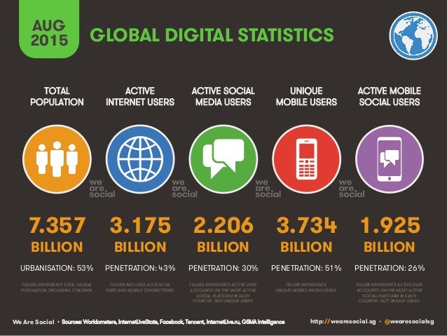 Damit surfen inzwischen fast 3,2 Milliarden Menschen im Internet – das entspricht einer Penetrationsrate von 43 Prozent, gemessen an der Weltbevölkerung von gut 7,36 Milliarden Menschen.