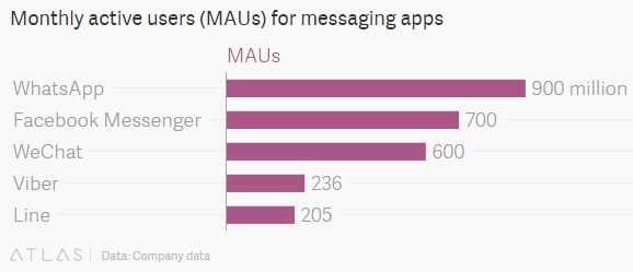 Damit setzt sich die Nachrichten-App deutlich vor die ärgsten Wettbewerber – zum einen den konzerneigenen Konkurrenten Facebook Messenger mit 700 Millionen Nutzern, zum anderen den chinesischen Rivalen WeChat mit zuletzt 600 Millionen Usern: