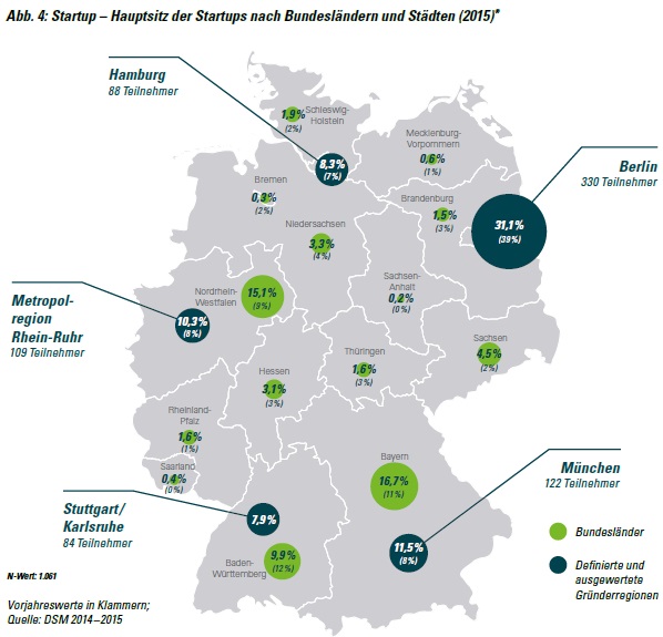 Damit ist die Bedeutung der Hauptstadt gegenüber dem Vorjahr deutlich gesunken: 2014 hatte Berlin noch einen Anteil von fast 40 Prozent aller Startups in Deutschland – siehe meinen Blog-Beitrag vor Jahresfrist hier.