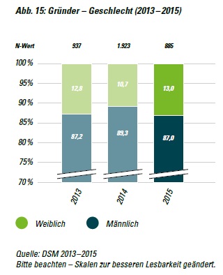 Interessant auch die demographischen Details zu den Gründern: Der ist im Schnitt – wie auch im Vorjahr – fast 35 Jahre alt und meist männlich. Immerhin konnten die Frauen ein wenig aufholen: So stieg der Anteil Gründerinnen um 2,3 Prozentpunkte auf nunmehr 13 Prozent – ein Wert freilich, der auf dem Niveau von 2013 liegt: